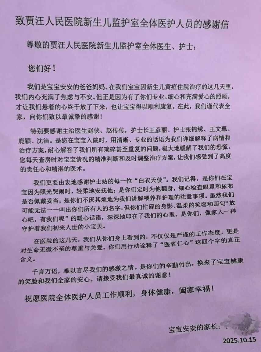 我们是宝宝安安的爸爸妈妈。在我们宝宝因新生儿黄疸住院治疗的这几天里,我们内心充满了焦虑与不安。但正是因为有了你们专业、细心和充满爱心的照顾,才让我们悬着的心终于放了下来,也让宝宝得以顺利康复。在此,我们谨代表全家,向你们致以最诚挚的感谢!