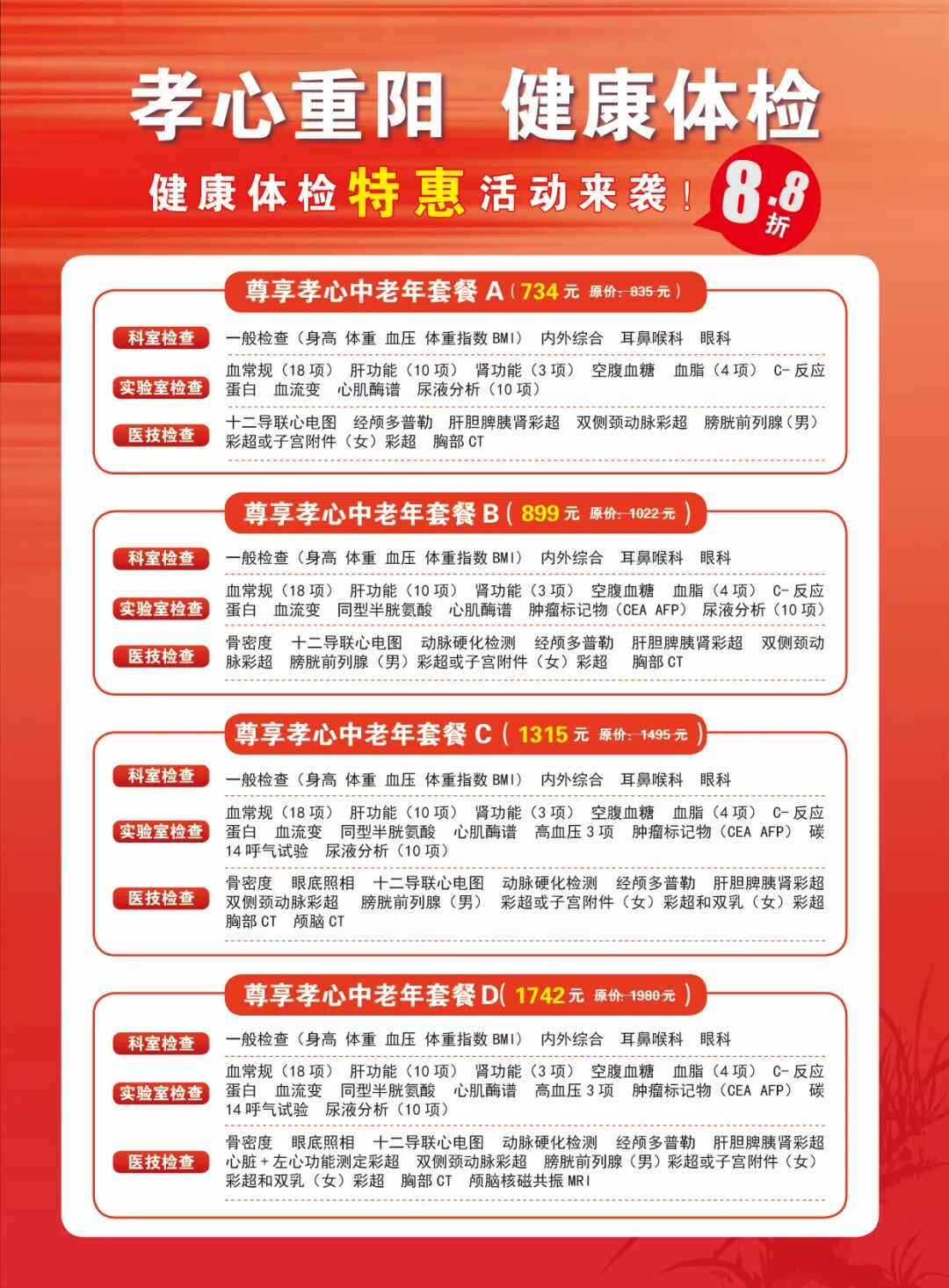 活动内容:四种体检套餐可根据自身需求进行选择,每项体检套餐均可享受8.8折优惠!趁时光不老,趁彼此都在,从关心他们的健康做起!