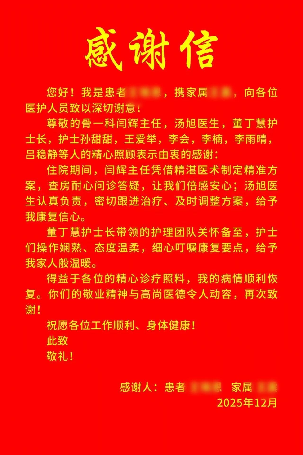 一个多月的住院康复期,见证了患者从完全无法自理到重新站立的艰辛历程,也见证了家乡医护团队的专业与付出。在感谢信中,患者特别对骨一科主任医师闫辉、主治医师汤旭、护士长董丁慧及护士孙甜甜、王爱举、李会、李楠、李雨晴、吕稳静等护理团队点名致谢:“闫辉主任凭借精湛医术制定精准方案,查房耐心问诊答疑,让我们倍感安心;汤旭医生认真负责,密切跟进治疗、及时调整方案,给予我康复信心。董丁慧护士长带领的护理团队关怀备至,护士们操作娴熟、态度温柔,细心叮嘱康复要点,给予我家人般温暖!”
