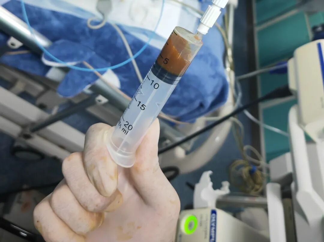 这是一个对稳定性、精准度要求极致的过程。在孙露露护士长、赵伟伟护士的紧密配合下,导丝在王艳斌手中仿佛被赋予了生命,巧妙探入、精细调整。当导丝最终跨越障碍,精准置入目标胆管的瞬间,大量淤积的脓性胆汁被成功引流出来,整个高难度过程在团队默契配合下平稳完成。梗阻解除,生命通道随之打开,感染源头被有效控制,为后续抗休克治疗赢得了最宝贵的主动权。