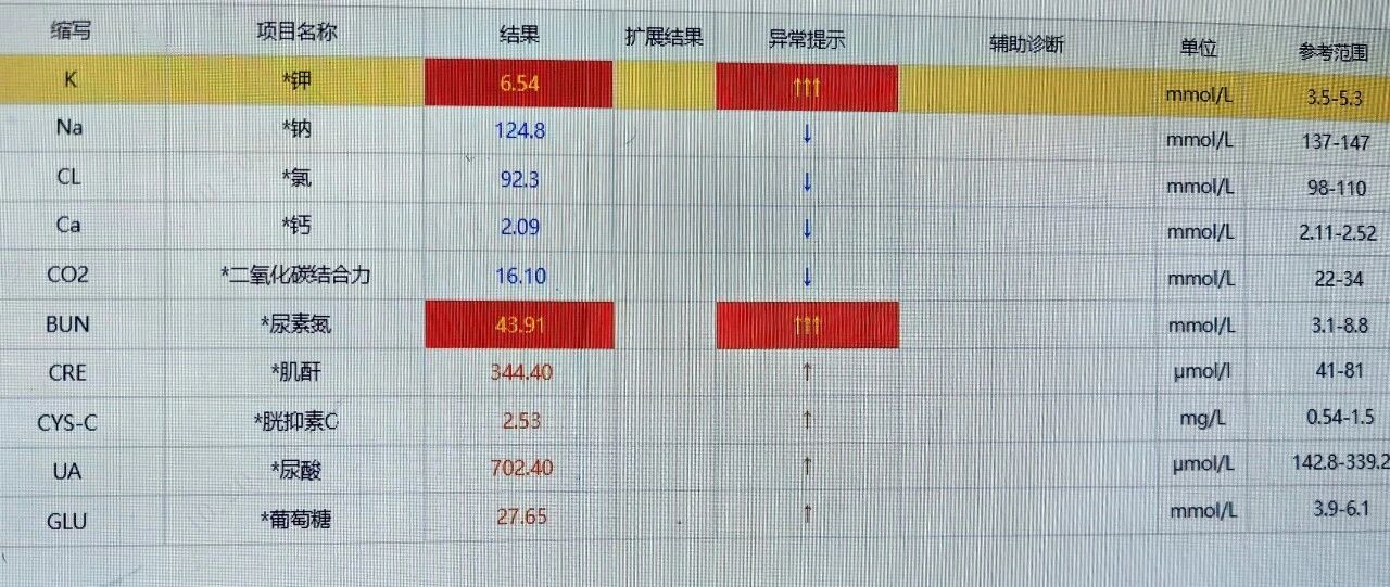 检查结果令人窒息:泌尿道感染、感染性休克、急性肾功能衰竭、双下肢深静脉血栓……多达21种诊断!其中,肾功能衰竭、高钾血症等一项项危急值如死亡倒计时般接踵而至,患者命悬一线!