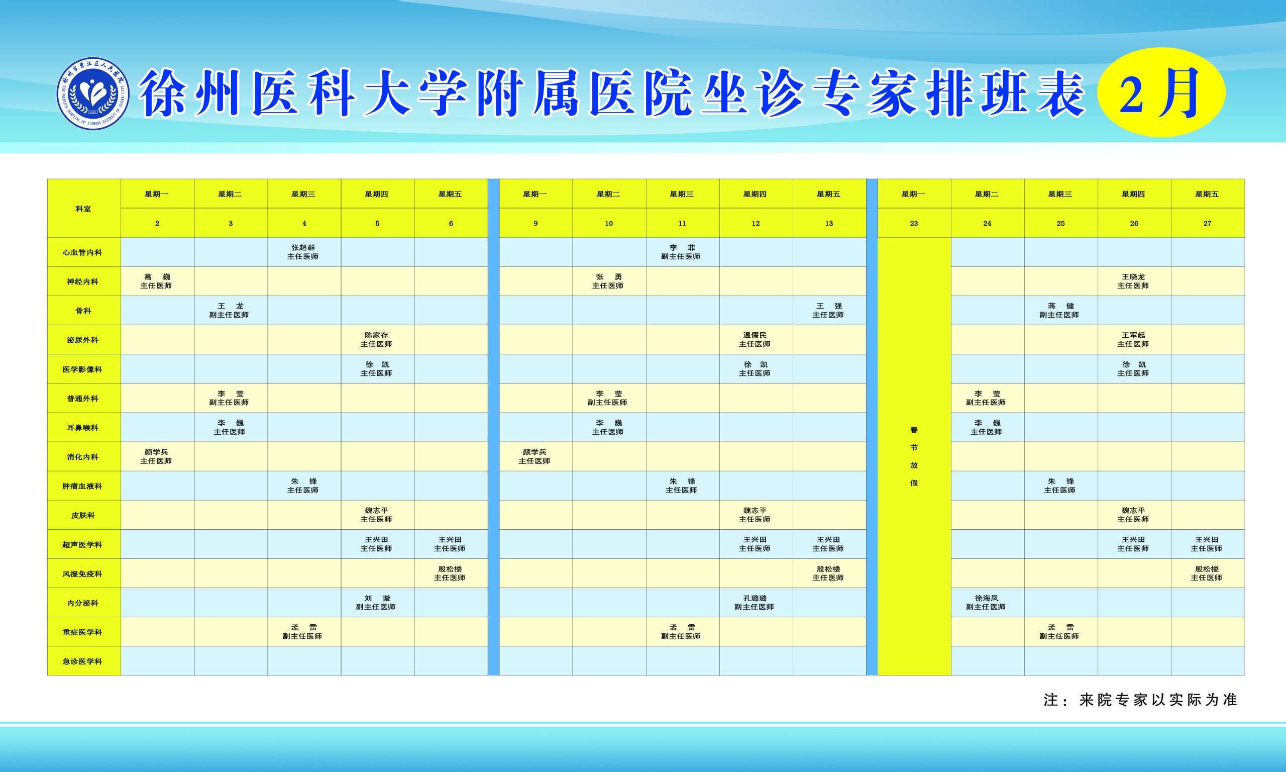 2026年2月份徐州医科大学附属医院专家团队来贾名单新鲜出炉,包括心血管内科、骨科、神经内科、泌尿外科、超声医学科等众多知名专家在我院开展门诊、手术、教学、查房等医疗工作,让老百姓在家门口就能享受到三级甲等医院知名专家优质医疗服务,欢迎广大群众前来咨询问诊。、