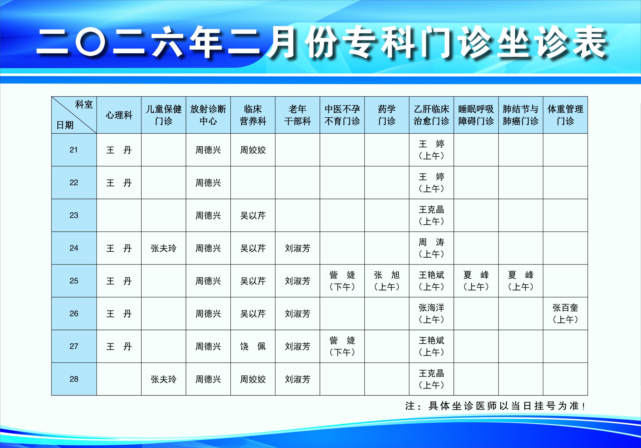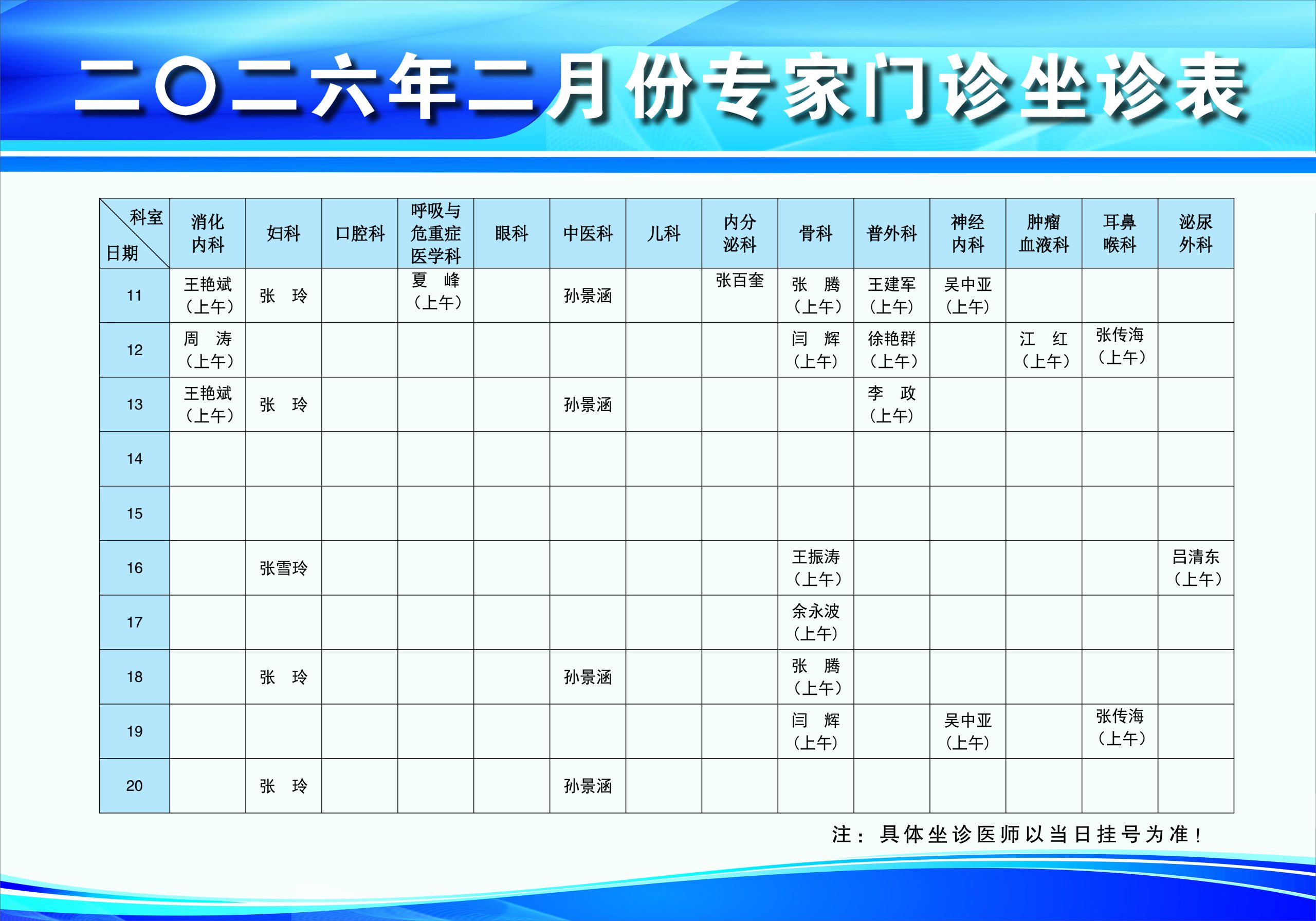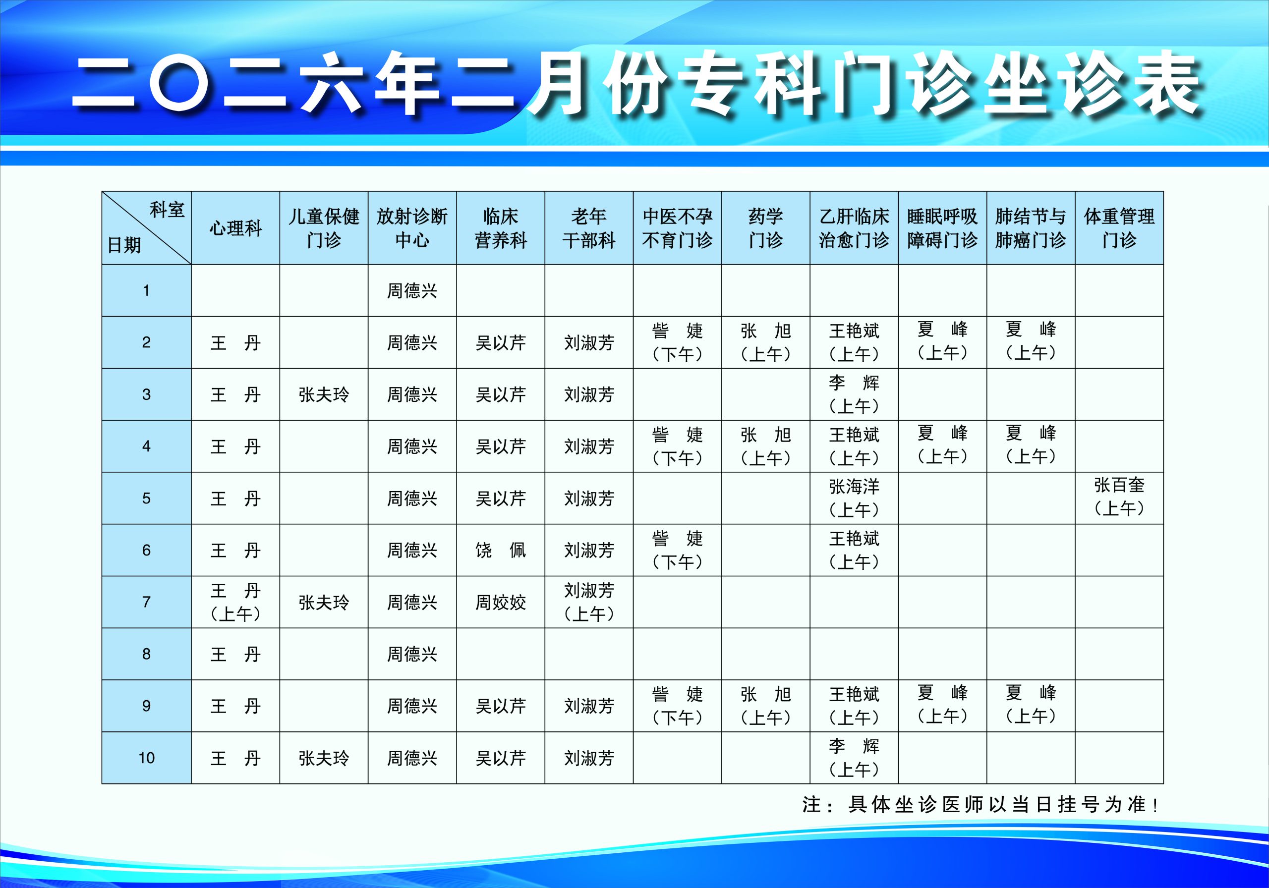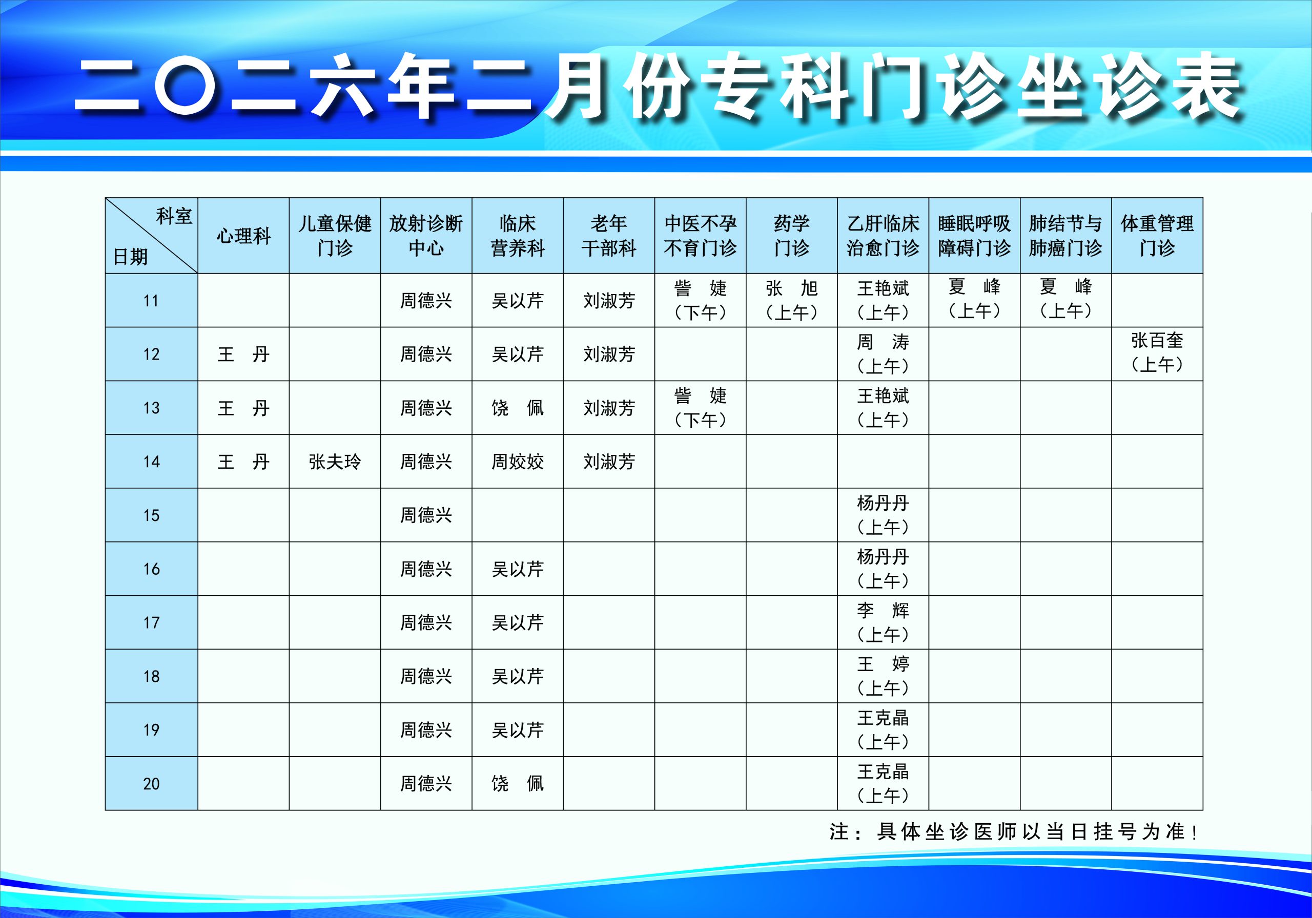 现将我院二月份门诊坐诊时间