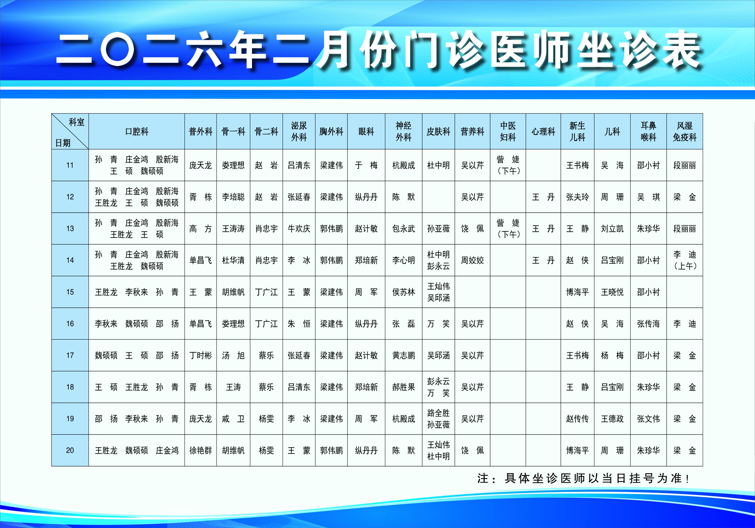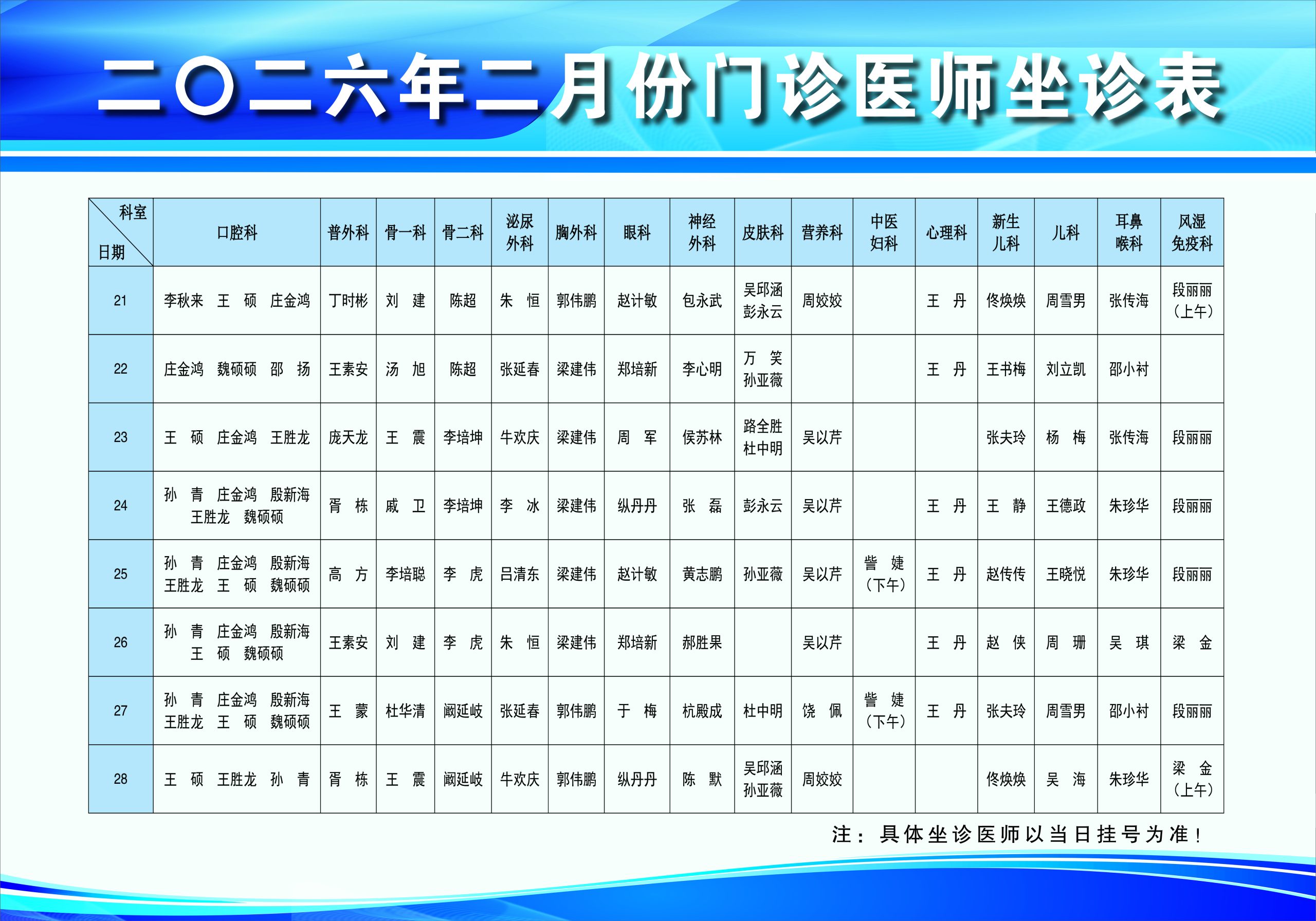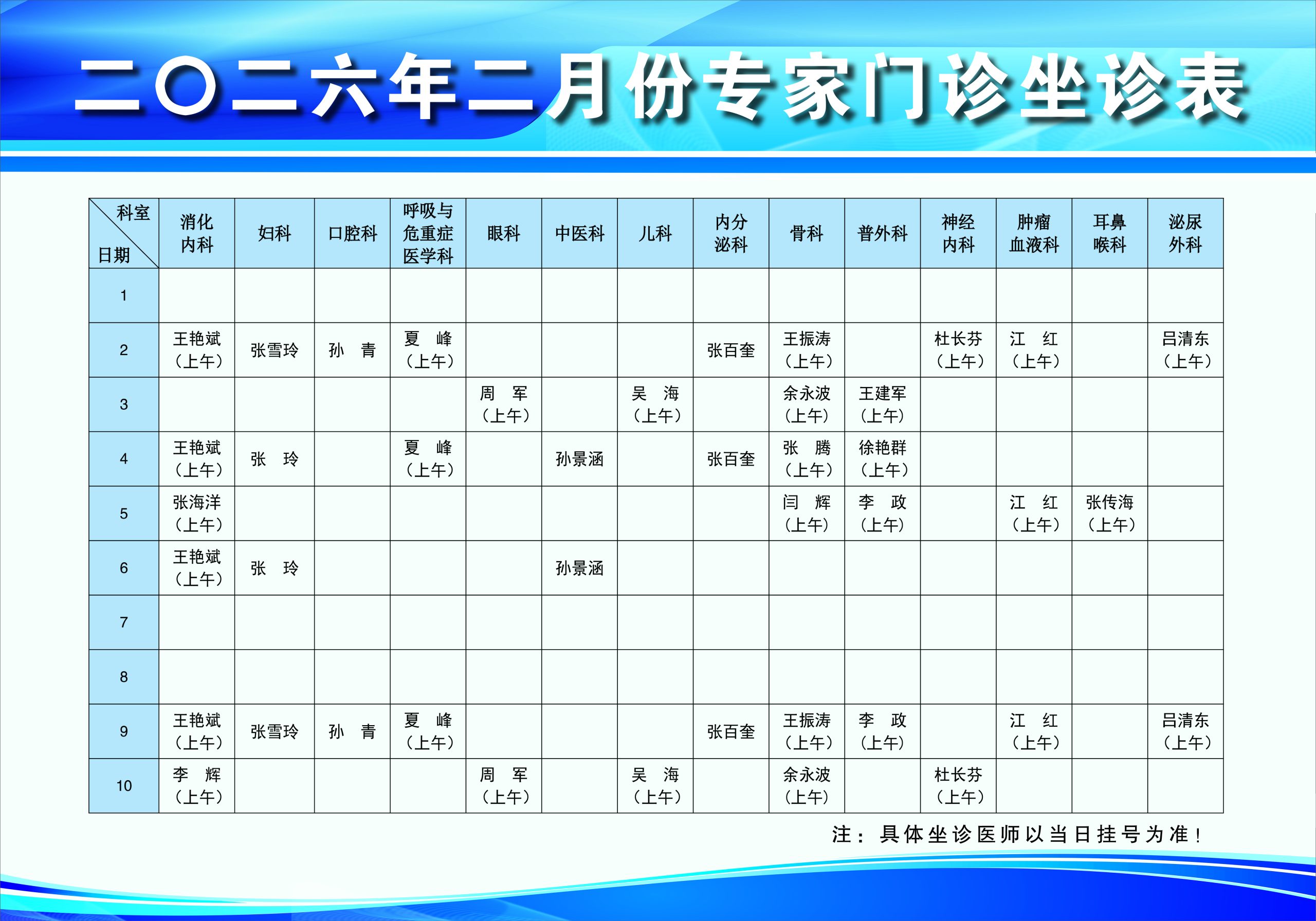 现将我院二月份门诊坐诊时间