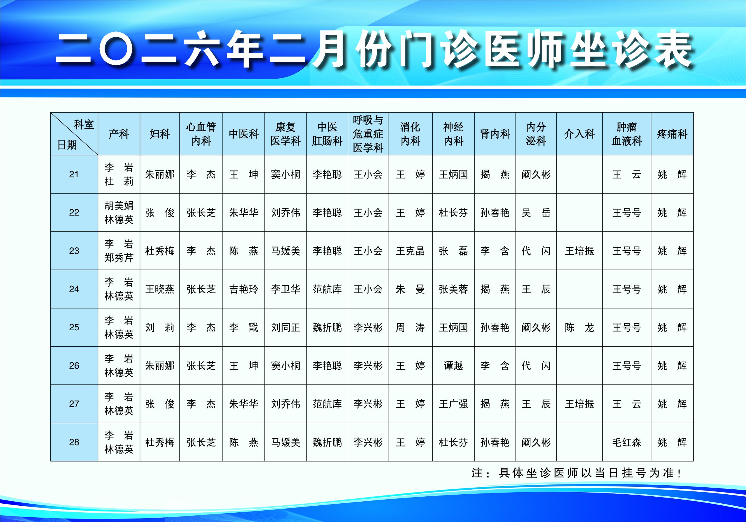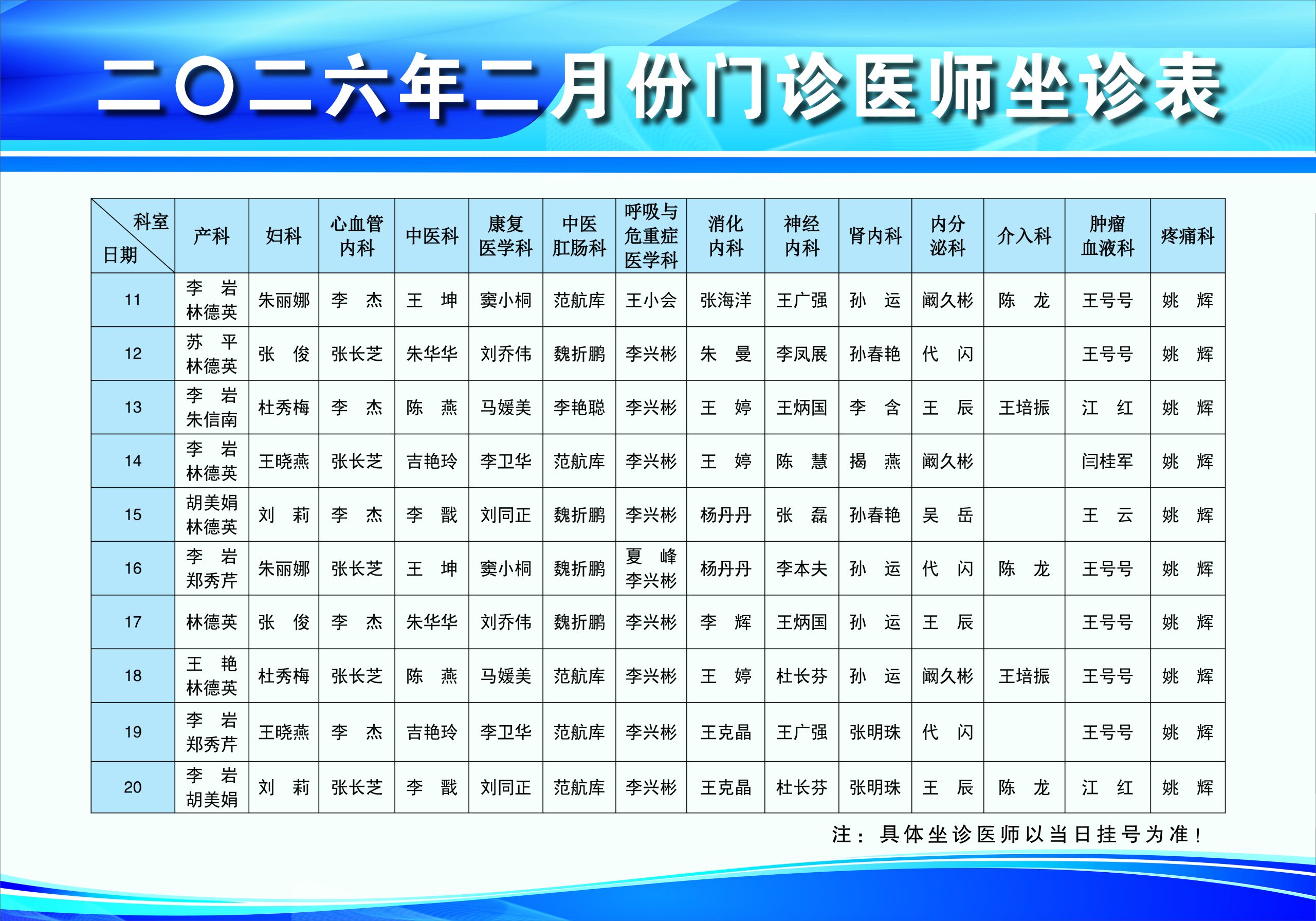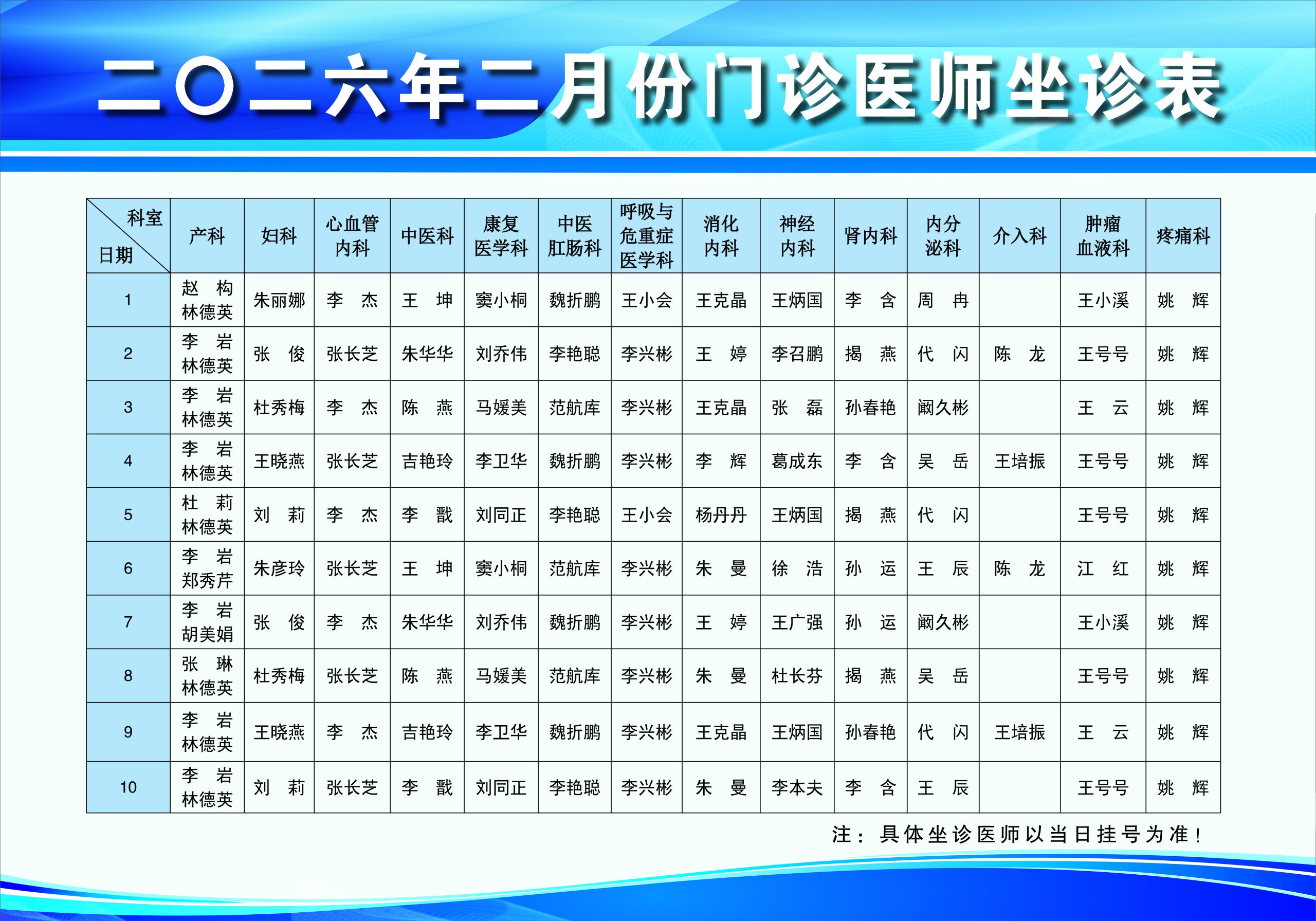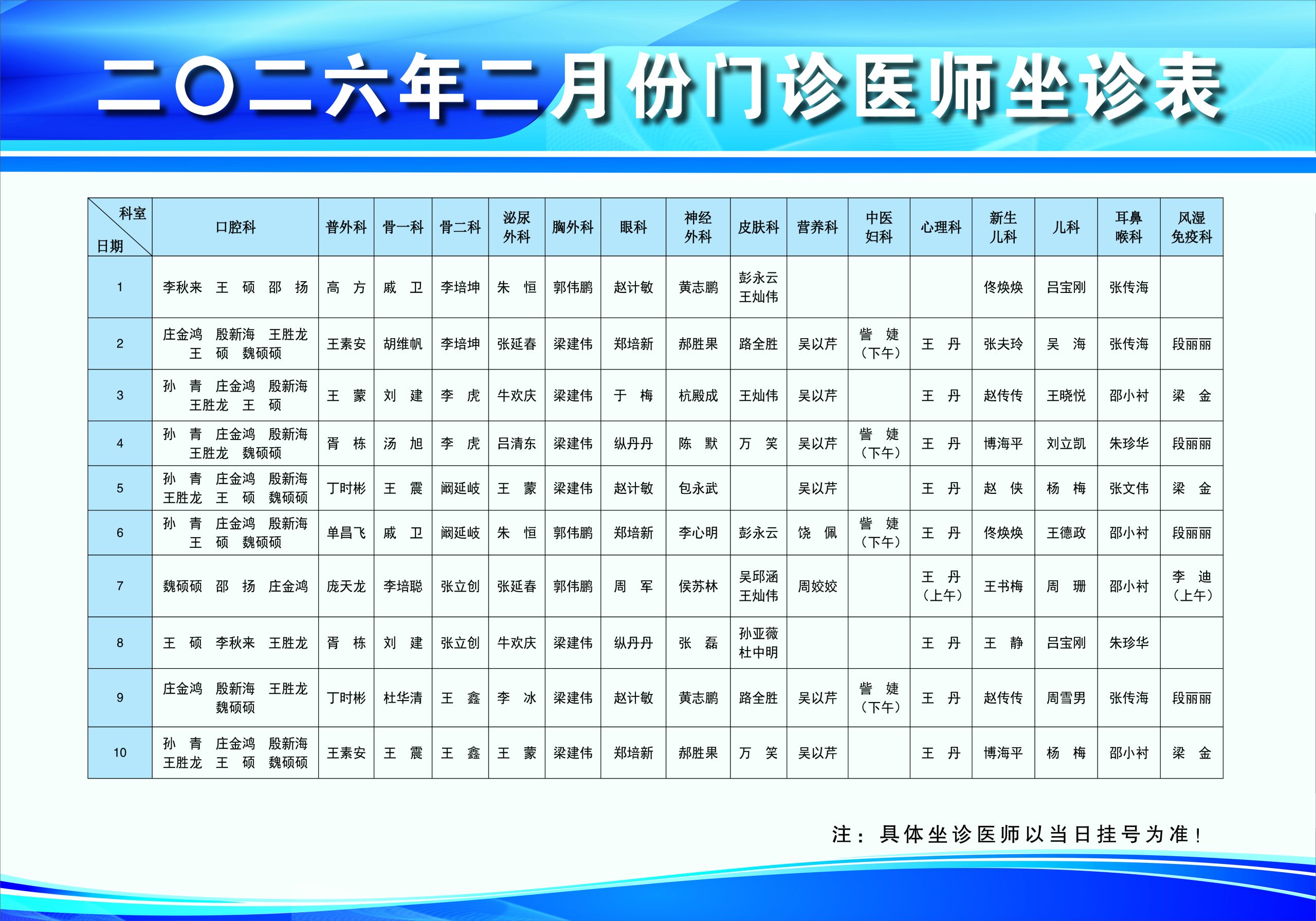 现将我院二月份门诊坐诊时间