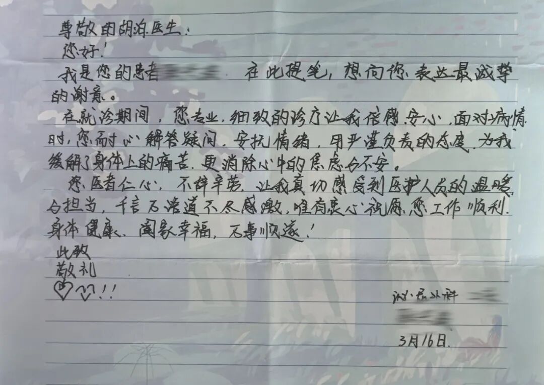 经过治疗,患者的腰痛及肩颈不适得到了明显缓解。出院前,患者特意写下了这封感谢信,不仅是为治疗“点赞”,更是为胡泊医生那份认真负责的态度而感动。